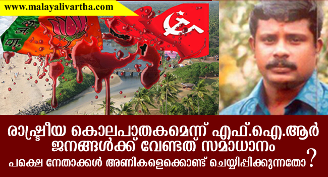 രാഷ്ട്രീയ കൊലപാതകമല്ല വ്യക്തി വിരോധമാണ് കൊലപാതകത്തിന് പിന്നിലെന്ന് നേതാക്കള് പറയുന്ന സമയത്താണ് ഈ എഫ്ഐആര് വന്നത്. ഇതോടെ നേതാക്കളുടെ പൊള്ളത്തരം പൊളിയുകയാണ്. ജനങ്ങള്ക്കാവശ്യം സമാധാനപരമായ ജീവിതമാണ്. അണികളെ അക്രമത്തിലേക്ക് തള്ളിവിടുന്ന എല്ലാ രാഷ്ട്രീയ പാര്ട്ടികളും ഇതില് നിന്നും പിന്മാറണം.