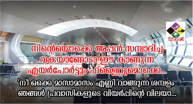 'നീ ഒക്കെ മാസാമാസം എണ്ണി വാങ്ങുന്ന ശമ്പളം ഞങ്ങള് പ്രവാസികളുടെ വിയര്പ്പിന്റെ വിലയാ. ഓരോ പ്രവാസികളും ഈ എയര്പോര്ട്ടിനുള്ളില് എത്തി ചേരുന്നത് പലപല പ്രശ്നങ്ങളുമായാണ്. ഉറ്റവരെ പിരിയുന്ന വേദനയും മരണവാര്ത്ത അറിഞ്ഞെത്തുന്നവരും, പലവിധ മാരക അസുഖങ്ങളും. അങ്ങനെയങ്ങനെ നിരവധി പ്രശ്നങ്ങളാണ് ഓരോ പ്രവാസികളുടെയും മനസ്സിനകത്ത്. നിങ്ങള് ഉദ്യോഗസ്ഥര് ഞങ്ങള് യാത്രക്കാരെ ചായയും കാപ്പിയും തന്നൊന്നും സല്ക്കരിക്കാന് ഞങ്ങള് ആവശ്യപ്പെടുന്നില്ല. പക്ഷെ, നിങ്ങളുടെ മുഖത്തുള്ള ഒരു ചെറു പുഞ്ചിരി, അത്രയെങ്കിലും ചെയ്തൂടെ ഞങ്ങള് പ്രവാസികളുടെയടുത്ത്. പകരം നിങ്ങള് ഞങ്ങളെ പുച്ഛത്തോടെയല്ലാതെ നോക്കിയിട്ടുണ്ടോ.
