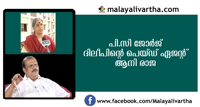 ജോര്ജ് ദിലീപിന്റെ പെയ്ഡ് ഏജന്റ് ആണോയെന്ന് സംശയമുണ്ട്. ബന്ധമുള്ള ആര്ക്കോ കേസില് പങ്കുണ്ടെന്ന പോലെയാണ് പി.സി ജോര്ജിന്റെ പെരുമാറ്റമെന്നും ആനി രാജ പറഞ്ഞു.