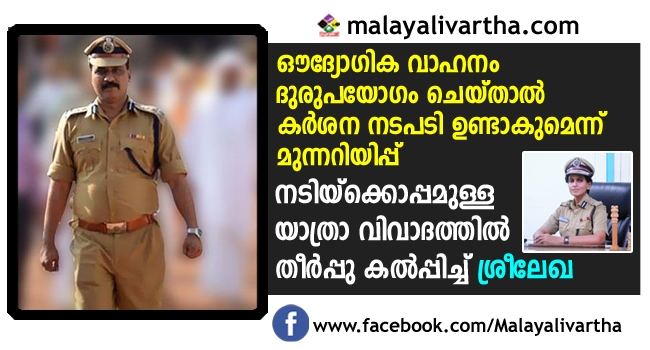 അതിനാലാണ് കടുത്ത നടപടി ഒഴിവായത്. അന്വേഷണ റിപ്പോര്ട്ടിന്റെ പശ്ചാത്തലത്തില് ഡി ഐ ജി യെ ജയില് മേധാവി താക്കീതു ചെയ്യുകയായിരുന്നു. ഇനി ഒദ്യോഗിക വാഹന ദുരുപയോഗം ചെയ്താല് കര്ശന നടപടി ഉണ്ടാകുമെന്നും ഡിഐ ജി ക്ക് ജയില് മേധാവി ആര്.ശ്രീലേഖ കൈമാറിയ താക്കീത് ഉത്തരവില് പറയുന്നു.