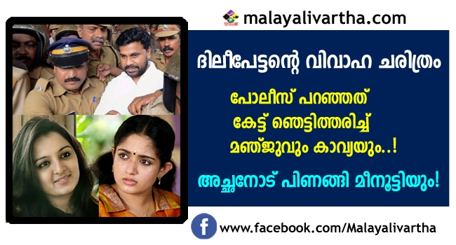 നടി മഞ്ജു വാരിയര് ദിലീപിന്റെ ആദ്യ ഭാര്യയല്ലെന്നും ബന്ധുക്കളും സുഹൃത്തുക്കളുമെല്ലാം ദിലീപിന്റെ ആദ്യ ഭാര്യയെപ്പറ്റിയുള്ള വിവരങ്ങള് രഹസ്യമാക്കിവച്ചുവെന്ന് പോലീസ് പറഞ്ഞതോടെ മഞ്ജുവും കാവ്യയും ആകെ ഞെട്ടിത്തരിച്ചിരിക്കുകയാണ്. ദിലീപ് നേരത്തേ വിവാഹിതനായിരുന്നുവെന്നാണ് പോലീസ് നല്കുന്ന വിവരം. അകന്ന ബന്ധുവായ യുവതിയാണ് ദിലീപിന്റെ ആദ്യ ഭാര്യ.