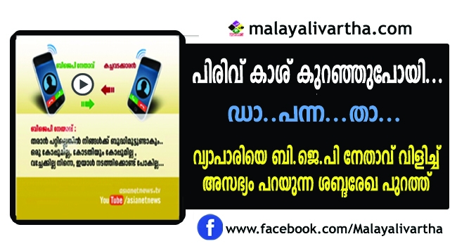 ബി.ജെ.പി ജില്ലാ നേതാവ് എന്ന നിലയിലാണ് സുഭാഷ് സ്വയം പരിചയപ്പെടുത്തിയാണ് നേതാവ് സംസാരിച്ചു തുടങ്ങുന്നത്. കഴിഞ്ഞ സ്റ്റേറ്റ് ഇലക്ഷനുമായി ബന്ധപ്പെട്ട് 5000 രൂപ പിരിവ് എഴുതിയെന്നും ആ തുക കിട്ടിയില്ലെന്നും ശബ്ദരേഖയില് നേതാവ് പറയുന്നു. എന്നാല് ഇത്രയും തുക നല്കാന് കഴിയില്ലെന്നും 3000 രൂപ നല്കാമെന്നും വ്യാപാരി എന്നു കരുതുന്നയാള് മറുപടി പറഞ്ഞു.