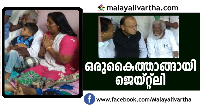 കേന്ദ്ര പ്രതിരോധ മന്ത്രി അരുണ് ജയ്റ്റ്ലിയുടെ സന്ദര്ശനത്തിനിടെയാണു ധനസഹായം കൈമാറിയത്. ജപ്തി നടപടി നേരിടുന്ന വീട്ടിലാണ് രാജേഷിന്റെ കുടുംബം കഴിയുന്നത്. ഇളയ സഹോദരന് ഓട്ടോ ഓടിക്കിട്ടുന്ന തുച്ഛമായ വരുമാനത്തില്നിന്നുവേണം ഒന്പതംഗ കുടുംബത്തിനുകഴിയാന്. അതിനുപരിഹാരം കാണണമെന്നു വീട്ടുകാര് കേന്ദ്രമന്ത്രിയോട് അഭ്യര്ഥിച്ചു. കേന്ദ്രസര്ക്കാരും ബിജെപിയും ഒപ്പമുണ്ടാകുമെന്നു ജയ്റ്റ്ലി രാജേഷിന്റെ കുടുംബത്തിന് ഉറപ്പു നല്കി.