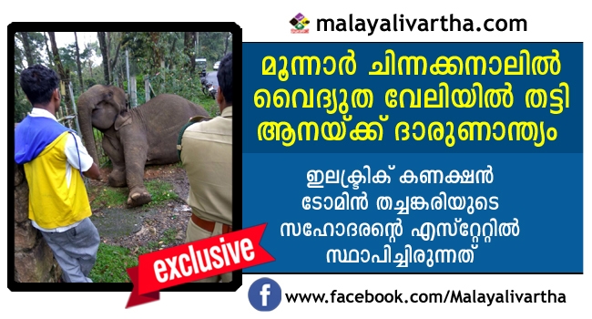 മൂന്നാര് ചിന്നക്കനാലില് ഐ.പി.എസ് ഓഫീസര് ടോമിന് ജെ തച്ചങ്കരിയുടെ സഹോദരന്റെ എസ്റ്റേറ്റില് സ്ഥാപിച്ചിരുന്ന വൈദ്യുത വേലിയില് തട്ടി ആന കത്തിക്കരിഞ്ഞു. ഫോര്ട്ട് വ്യുവിനോട് ചേര്ന്നുള്ള എസ്റ്റേറ്റിലാണ് ഇലക്ട്രിക് ഡയറക്റ്റ് കണക്ഷന് കൊടുത്തിരുന്നത്. കാട്ടുമൃഗങ്ങളും നാട്ടുമൃഗങ്ങളും മനുഷ്യരും സഞ്ചരിക്കുന്ന റോഡരികിലാണ് ഈ വൈദ്യുത വേലി സ്ഥാപിച്ചിരിക്കുന്നത്.