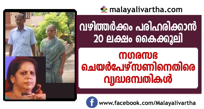 വഴിത്തര്ക്കം പരിഹരിക്കാന് നഗരസഭ ചെയര്പേഴ്സണ് 20 ലക്ഷം കൈക്കൂലി ആവശ്യപ്പെട്ടെന്ന് വൃദ്ധദമ്പതികളുടെ പരാതി ; വ്യക്തി വിരോധം തീർക്കുകയാണെന്ന് ചെയര്പേഴ്സണ്