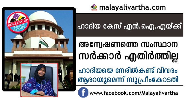 ഹാദിയ കേസിനെ കുറിച്ചുള്ള അന്വേഷണം സുപ്രീം കോടതി എന്.ഐ.എയ്ക്ക് കൈമാറി, മുന് ജസ്റ്റിസ് ആര്.വി.രവീന്ദ്രന്റെ മേല്നോട്ടത്തിലായിരിക്കും കേസിന്റെ അന്വേഷണം