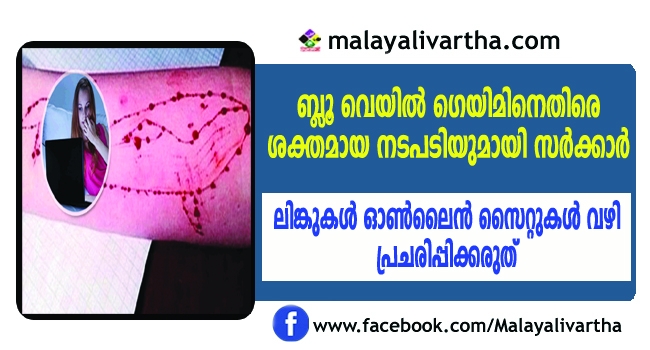 അപകടകാരിയായ ബ്ലൂ വെയില് ഗെയിമിനെതിരെ ശക്തമായ ശക്തമായ നടപടിയുമായി സംസ്ഥാന സര്ക്കാര്. പരാതികള് അന്വേഷിച്ച് ഉടന് റിപ്പോര്ട്ട് നല്കും. ഓണ്ലൈന് സൈറ്റുകള് വഴി ഗെയിമിന്റെ ലിങ്കുകള് പ്രചരണം നടത്തുന്നവര്ക്ക് എതിരെ കേസെടുക്കാനും നിര്ദ്ദേശം ഉണ്ട്