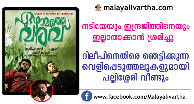 ഇന്ത്യന് സിനിമയില് മിന്നുന്ന വിജയം കൊയ്ത ടീമാണ് എംടി, ഹരിഹരന്. ഈ ടീമിന്റെ ഏഴാമത്തെ വരവ് എന്ന സിനിമയുടെ പരാജയത്തിന് കാരണമായത് ദിലീപെന്ന് ആരോപണം. ഇന്ദ്രജിത്തും നടിയും വിനീതും പ്രധാന വേഷത്തില് എത്തിയ സിനിമ പരാജയപ്പെടാന് കാരണമായത് ദിലീപ് വിതരണത്തിന് എടുത്തതാണെന്ന് പ്രശസ്ത പത്രപ്രവര്ത്തകന് പെല്ലിശേരിയുടേതാണ് വെളിപ്പെടുത്തല്.