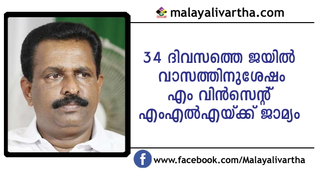 വീട്ടമ്മയെ പീഡിപ്പിച്ച കേസ്: എം വിന്സെന്റ് എംഎല്എയ്ക്ക് ജാമ്യം; പുറത്തിറങ്ങുന്നത് 34 ദിവസത്തെ ജയില് വാസത്തിനുശേഷം
