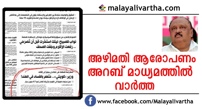 കുവൈത്തിലെ പ്രവാസിയായ ഇന്ത്യന് മന്ത്രി അഴിമതി ആരോപണ വിധേയന് എന്ന തലക്കെട്ടോടെയാണു പത്രത്തിന്റെ ഒന്നാം പേജില് വാര്ത്ത വന്നിരിക്കുന്നത്.അധികാരത്തില് കയറി കേവലം 4 മാസം തികയും മുമ്പാണു മന്ത്രി അഴിമതി ആരോപണ വിധേയനായിരിക്കുന്നത്. തോമസ് ചണ്ടിയുടെ പേരില് അഴിമതി ആരോപണം ഉയരുന്നത് ഇത് ആദ്യമല്ല.