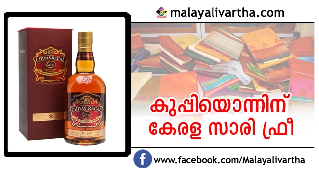 100 ഡോളറിന്റെ(6402) ഷിവാസ് റീഗല് വാങ്ങുമ്പോള് ഉപഭോക്താക്കള്ക്ക് കേരള സാരിയാണ് ഷിവാസ് റീഗല് ബ്രാന്ഡിനൊപ്പം ലഭിക്കുന്നത്. 100 ഡോളര് വില വരുന്ന ഷിവാസ് റീഗലും മാര്ട്ടല് കോണിയാക്കും വാങ്ങിയാലും കേരള സാരി ലഭിക്കും.