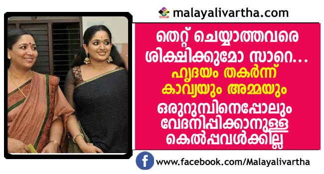 തങ്ങള് ഒരു തെറ്റും ചെയ്തിട്ടില്ലെന്ന നിലപാടില് ഉറച്ചു നില്ക്കുകയാണ് കാവ്യ മാധവനും അമ്മയും കുടുംബവും. തങ്ങള് ഒരു തെറ്റും ചെയ്തിട്ടില്ല. തെറ്റ് ചെയ്യാത്തവരെ ശിക്ഷിക്കുമോ എന്നാണ് കാവ്യയുടെ കുടുംബം ചോദിക്കുന്നത്. ഒന്നും മറച്ച് വയ്ക്കാത്ത ഉറ്റ് സുഹൃത്തുക്കളാണ് കാവ്യയും അമ്മയും. പക്ഷെ ഇരുവരും തങ്ങള് ചെയ്യാത്ത കുറ്റത്തിന് മാധ്യമങ്ങളിലൂടെ വേട്ടയാടുന്നുവെന്നാണ് പറയുന്നത്. ഒരുറുമ്പിനെപ്പോലും വേദനിപ്പിക്കാനുള്ള കെല്പ്പവള്ക്കില്ലെന്നാണ് കാവ്യയുടെ ബന്ധുക്കള് പറയുന്നത്.