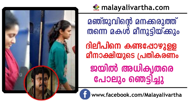 എന്നാല് മീനാക്ഷിയുടെ പ്രതികരണം ജയില് അധികൃതരെ അത്ഭുതപ്പെടുത്തി. ദിലീപിനെ കണ്ടപ്പോള് കാര്യമായ ഭാവ വ്യത്യാസം ഒന്നും മീനാക്ഷിയുടെ മുഖത്ത് ഉണ്ടായിരുന്നില്ല. കരുത്തോടെ അച്ഛനോട് കാര്യങ്ങളെല്ലാം ചോദിച്ചറിയുകയായിരുന്നു.