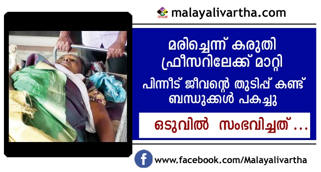 മരിച്ചെന്ന് കരുതി മൊെബെല്ഫ്രീസറിലേക്കു മാറ്റിയ വീട്ടമ്മ ശ്വസിച്ചു. ഒടുവില് മരണമെത്തിയത് ആശുപത്രിയില് പ്രവേശിപ്പിച്ച് 12 മണിക്കുറിനുശേഷം. വണ്ടന്മേട് പുതുവല് രത്നവിലാസം മുനിസ്വാമിയുടെ ഭാര്യ രത്ന(51)ത്തെയാണ് മരിച്ചെന്ന് ഉറപ്പിച്ച് ബന്ധുക്കള് വീട്ടില് ഫ്രീസറില്വച്ചത്. അന്തിമോപചാരം അര്പ്പിക്കാനെത്തിയ അയല്വാസിക്കാണു രത്നത്തിന് ജീവനുണ്ടെന്നു തോന്നിയത്. തുടര്ന്ന് വണ്ടന്മേട് എസ്.ഐ: വിശ്വനാഥനെ വിവരമറിയിക്കുകയായിരുന്നു.
