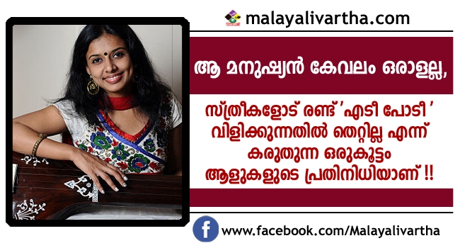 “ ഇന്നിതാ തൃശ്ശൂര് dtpc സംഘടിപ്പിച്ച ഓണാഘോഷ പരിപാടി തീരവെ അനുഭവപ്പെട്ട ഒരുകാര്യം പങ്കു വയ്ക്കട്ടെ !! ഞാനും എൻറെ കൂട്ടുകാരും അവിടെ പാടി , പൂർണമായും ആഘോഷമാക്കിയ തൃശ്ശൂരെ നല്ല മുത്തുപോലത്തെ ആളുകൾ , കരുതലോടെ പെരുമാറിയ സംഘാടകർ എല്ലാവർക്കും ഒരു കുന്ന് സ്നേഹം മാത്രം ! പക്ഷെ പാടിക്കൊണ്ടിരിക്കെ , അവസാനത്തൊടടുക്കുംതോറും ഒരു മനുഷ്യൻ മുൻ വരികളിൽ ഒന്നിൽ ഇരുന്ന് മുഖത്തുനോക്കി അസഭ്യം പറയുകയാണ് !!പതിവുപോലെ കേട്ടില്ലെന്ന് നടിച്ചു , ഞങ്ങൾ സ്ത്രീകളെ കുട്ടിക്കാലം മുതൽ ശീലിപ്പിക്കുന്നതാണത് ! പിന്നീടെപ്പോഴോ , പതിവില്ലാത്ത ഒരു അത്മാഭിമാന ബോധം,ഹഹാ -എനിക്കപ്പോൾ തോന്നിയ വേദന സദസ്സിനോട് പങ്കു വയ്ക്കണം എന്നു തോന്നി ,പറയുകയും ചെയ്തു ! ജനപ്രതിനിധികൾ , ഉയർന്ന പോലീസ് ഉദ്യോഗസ്ഥർ എന്നിവരൊക്കെ ഇരിക്കെയാണ് സധെെര്യം ഒരാൾ ഇങ്ങനെ പെരുമാറുന്നത് ! ആ മനുഷ്യൻ കേവലം ഒരാളല്ല ,സ്ത്രീകളോട് രണ്ട് ‘എടീ പോടീ ‘ വിളിക്കുന്നതിൽ തെറ്റില്ല എന്ന് കരുതുന്ന ഒരുകൂട്ടം ആളുകളുടെ പ്രതിനിധിയാണ് !! ഞാൻ പറഞ്ഞ വാക്കുകളിൽ അസ്വസ്ഥത തോന്നിയ ചില ചെറുപ്പക്കാർ അടുത്ത് വന്നു… ചേച്ചി ഞങ്ങടെ നാട്ടുകാരെ കുറച്ചുകാണിച്ചത് ശരിയായില്ല എന്നാണ് അവരുടെ പക്ഷം !! കുട്ട്യോളെ -ഈ നാടെന്നല്ല ലോകം മുഴുവൻ ഉള്ള സകല നാടുകളോടും നാട്ടാരോടും സ്നേഹം മാത്രം ! ആ മനുഷ്യൻറെ ധാർഷ്ട്യത്തൊട് മാത്രമാണ് എൻറെ കലഹം ! ഇത്തരം ആളുകൾ നിങ്ങളുടെ പരിസരത്തും ഇല്ലെന്ന് ഉറപ്പുവരുത്തേണ്ടത് നിങ്ങളുടെ കൂടെ ഉത്തരവാദിത്തം അല്ലെ ! ഒടുവിൽ ആളുകൾ ഉപദേശവും തരുന്നു -” സ്റ്റേജിൽ നിൽക്കുമ്പോൾ ഇതൊന്നും ശ്രദ്ധിക്കരുത് ! അതാെരു കള്ളുകുടിയനല്ലേ, പോട്ടെ !!” സഹജീവികളോട് വ്യത്തികേട് പ്രവർത്തിക്കാനുള്ള licence അല്ല മദ്യപാനം ! പിന്നെ പൊതുവെ ഉപദേശിക്കുന്നവരോട് ഒന്നു പറഞ്ഞോട്ടെ , സംഗീതത്തിലെ എല്ലാം അഭിപ്രായ വ്യത്യാസങ്ങളും അറിയിക്കാനുള്ള സ്വാതന്ത്ര്യം ഓരോ പ്രേക്ഷകനും ഉണ്ട് ,വിഷയം ഏതുമാവട്ടെ പരസ്പരം കെെമാറുന്ന ഭാഷ അത് മാന്യമാവണ്ടെ !ചിലപ്പോഴൊക്കെ ഞങ്ങൾക്ക് സങ്കടവും ദേഷ്യവും വരുമെന്ന് തോന്നുന്നു! ”