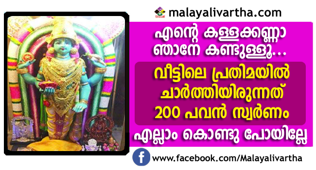 ആ വിഗ്രഹത്തില് അണിയിച്ചിരുന്ന 65 പവന് സ്വര്ണം മോഷണംപോയി. ഹെഡ്പോസ്റ്റ് ഓഫീസിനു സമീപം താമസിക്കുന്ന ഹോമിയോ ഡോക്ടര് പി.ജി. മേനോന്റെ കൃഷ്ണ നികേതന് വീട്ടിലാണു മോഷണമുണ്ടായത്. ഇന്നലെ പുലര്ച്ചെയാണു സംഭവം.വീട്ടിലെ പൂജാമുറിയില് ഗുരുവായൂരപ്പന്റെ വിഗ്രഹത്തില് അണിഞ്ഞിരുന്ന ആഭരണങ്ങളാണു നഷ്ടപ്പെട്ടത്.