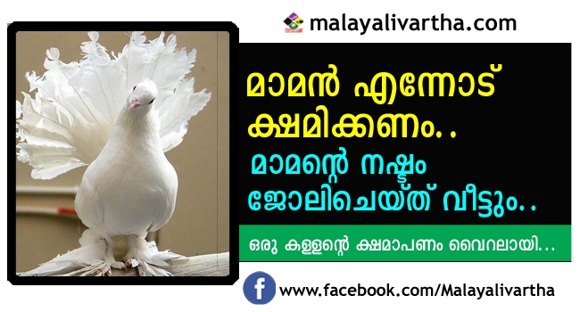 ‘.......മാമൻ എന്നോടു ക്ഷമിക്കണം...എന്റെ അറിവില്ലായ്മകൊണ്ടു ജീവിതത്തിൽ ആദ്യമായി ചെയ്ത തെറ്റാണ് .ഇനി ആവർത്തിക്കില്ല. മാമന്റെ വീട്ടിൽ നിന്നു പ്രാവുകളെ എടുത്തുകൊണ്ടു പോയതിനുശേഷം എനിക്കു പഠിക്കാൻ കഴിയുന്നില്ല.....എന്റെ അമ്മ എന്നെ ഒരുപാട് വഴക്കു പറഞ്ഞു.....മാമന് ഉണ്ടായ നഷ്ടം ഞാൻ ജോലി ചെയ്തു വീട്ടും. ഞാൻ ഒരു തവണ വീട്ടിൽ വന്നിട്ടുണ്ട്....എന്നെ ശപിക്കരുത്....ഒരു പ്രാവിനു കണ്ണു കണ്ടുകൂടാ...ഞാൻ അതിന്റെ കണ്ണിൽ കിടന്ന തൂവലുകൾ വെട്ടിമാറ്റി...സോറി...ഞാൻ പ്രാവുകളെ തിരികെ ഏൽപിക്കുന്നു. എന്റെ പ്രാവുകളും കൂടി ഇതിനോടൊപ്പമുണ്ട്.... ഞാൻ ഇനി പ്രാവുകളെ എടുക്കില്ല.. സത്യം...ക്ഷമിക്കണേ...’