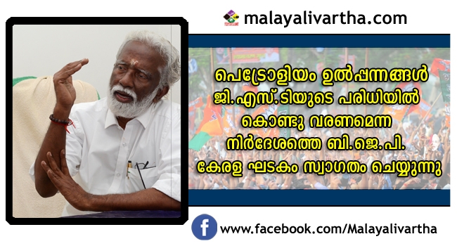 പെട്രോളിയം ഉൽപ്പന്നങ്ങൾ ജി.എസ്.ടിയുടെ പരിധിയിൽ കൊണ്ടു വരണമെന്ന കേന്ദ്ര പെട്രോളിയം മന്ത്രി ധർമ്മേന്ദ്ര പ്രധാന്റെ നിർദ്ദേശത്തെ ബി.ജെ.പി കേരള ഘടകം സ്വാഗതം ചെയ്യുന്നുവെന്നും വില വര്ധനവില് കേന്ദ്രത്തെ പഴിക്കുന്ന സംസ്ഥാന സര്ക്കാര് എന്തുകൊണ്ട് പെട്രോളിയം ഉത്പന്നങ്ങളെ ജിഎസ്ടിയുടെ പരിധിയില് കൊണ്ടുവരുന്നില്ലെന്നും ബി.ജെ.പി സംസ്ഥാന അധ്യക്ഷന് കുമ്മനം രാജശേഖരന്. നികുതിക്ക് പുറമെ പെട്രോളിയം ഉല്പ്പന്നങ്ങളുടെ മേല് പ്രത്യേക സെസ് ചുമത്താനും കേരള സര്ക്കാര് മടിച്ചില്ലെന്നാണ് അദ്ദേഹം പറയുന്നത്. തന്റെ ഫേസ്ബുക്ക് പേജിലൂടെയാണ് അദ്ദേഹം തന്റെ അഭിപ്രായം രേഖപ്പെടുത്തിയത്.