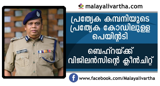 പോലീസ് സ്റ്റേഷന് പെയിന്റടി വിവാദത്തില് ഡി.ജി.പി ലോക്നാഥ് ബെഹ്റയ്ക്ക് വിജിലന്സിന്റെ ക്ലീന്ചിറ്റ്