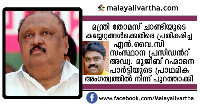 മന്ത്രി തോമസ് ചാണ്ടിയുടെ കയ്യേറ്റങ്ങള്ക്കെതിരെ പ്രതികരിച്ച നേതാക്കള്ക്കെതിരെ നടപടിയുമായി എന്.സി.പി. ചാണ്ടിയുടെ കയ്യേറ്റങ്ങള്ക്കെതിരെ പരസ്യമായി പ്രതികരിച്ച എന്.വൈ.സി സംസ്ഥാന പ്രസിഡന്റ് അഡ്വ. മുജീബ് റഹ്മാനെ പാര്ട്ടിയുടെ പ്രാഥമിക അംഗത്വത്തില് നിന്ന് പുറത്താക്കി. പാര്ട്ടിയുടെ പിന്തുണ മന്ത്രിക്കാണെന്ന് എന്.സി.പി സംസ്ഥാന പ്രസിഡന്റ് ടിപി പീതാംബരന് മാസ്റ്റര് കോഴിക്കോട് പറഞ്ഞു.