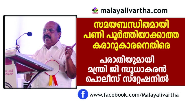 ദേശീയ പാതയായ മംഗലപുരം- കരമന റോഡിന്റെ പണി ഏറ്റെടുത്ത് സമയബന്ധിതമായി പൂര്ത്തീകരിക്കാത്ത കരാറുകാരായ റിവൈ കമ്പനിക്കെതിരെയാണ് മന്ത്രി ജി സുധാകരന് പൊലീസില് പരാതി നല്കിയത്. കഴക്കൂട്ടം അസിസ്റ്റന്റ് കമ്മീഷണര്ക്ക് മുമ്ബാകെ നേരിട്ടെത്തിയാണ് മന്ത്രി പരാതി എഴുതി നല്കിയത്.