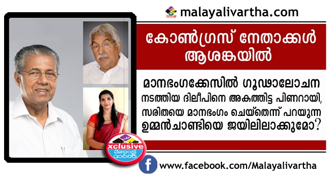 കൊച്ചിയില് യുവനടിയെ തട്ടിക്കൊണ്ട് പോയി മാനഭംഗപ്പെടുത്തിയ കേസില് ഗൂഢാലോചന നടത്തിയെന്ന് ആരോപിച്ച് നടന് ദിലീപിനെ 85 ദിവസം ജയിലിലടച്ച മുഖ്യമന്ത്രി പിണറായി വിജയന്, സരിതാ എസ്. നായരെ മാനഭംഗപ്പെടുത്തിയെന്ന് പറയുന്ന ഉമ്മന്ചാണ്ടിക്കെതിരെ കേസെടുത്ത് അദ്ദേഹത്തെ അഴിക്കുള്ളിലാക്കുമോ? ഈ ചോദ്യം കേരളത്തിലെ കോണ്ഗ്രസ് നേതൃത്വത്തെ അങ്കലാപ്പിലാക്കിയിരിക്കുകയാണ്. സ്ത്രീസുരക്ഷയ്ക്ക് മുന്ഗണന നല്കി അധികാരത്തിലേറിയ പിണറായി സര്ക്കാര് മുഖംനേക്കാതെ നടപടി സ്വീകരിക്കുന്നതായിരുന്നു ഇതുവരെയുള്ള കാഴ്ച. വടക്കാഞ്ചേരിക്കേസില് മാത്രമാണ് അദ്ദേഹം ശ്ക്തമായ നടപടി സ്വീകരിക്കാതിരുന്നത്. എന്നാല് ഇവിടെ കാര്യങ്ങള് അങ്ങനെയല്ല.