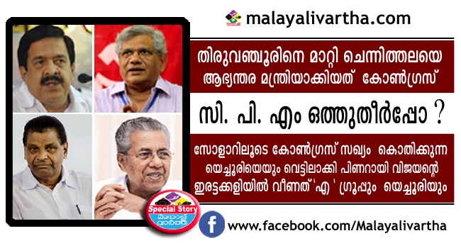 സോളാര് കമ്മീഷന് റിപ്പോര്ട്ടിന്റെ പേരില് മുഖ്യമന്ത്രി പിണറായി വിജയന് നടത്തിയത് ഇരട്ടക്കളിയോ. കോൺഗ്രസ് ബന്ധമില്ലെങ്കിൽ ബംഗാളിൽ പാർട്ടിക്ക് ഇനി തിരിച്ചു വരൻ കഴിയില്ലെന്ന് മനസ്സിലാക്കിയ യെച്ചൂരി കോൺഗ്രസ് ബന്ധത്തിനായി മുറവിളി കൂടുമ്പോൾ പിണറായി സോളാർ ബോംബ് പൊട്ടിച്ചു. മുന്മുഖ്യമന്ത്രി ഉമ്മന്ചാണ്ടി അടക്കമുള്ള പ്രമുഖര്ക്കെതിരെ അന്വേഷണത്തിനു നിര്ദ്ദേശിച്ച പിണറായി അതുവഴി സിപിഎം ജനറല് സെക്രട്ടറി സീതാറാം യെച്ചൂരിയെയും ലക്ഷ്യമിട്ടു എന്നാണ് പാർട്ടിയിലെ ഒരു വിഭാഗം കരുതുന്നത്.