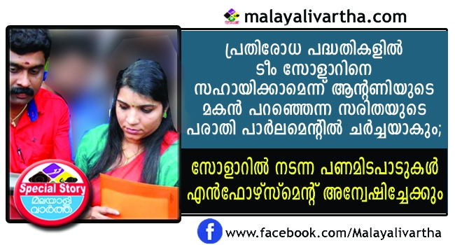 പ്രതിരോധ പദ്ധതികളില് ടീം സോളാറിനെ സഹായിക്കാമെന്ന് ആന്റണിയുടെ മകന് പറഞ്ഞെന്ന സരിതയുടെ പരാതി പാര്ലമെന്റില് ചര്ച്ചയാകും; സോളാറില് നടന്ന പണമിടപാടുകള് എന്ഫോഴ്സ്മെന്റ് അന്വേഷിച്ചേക്കും