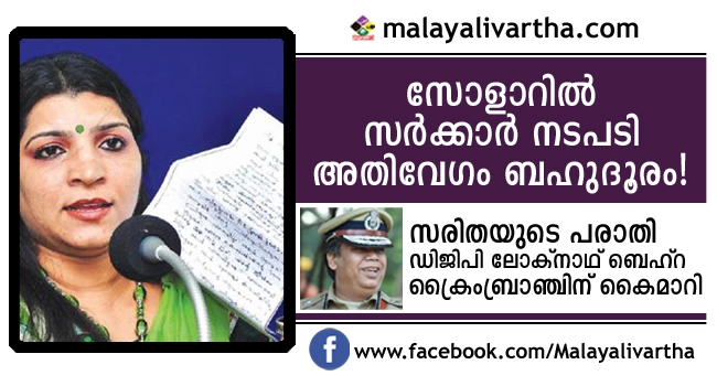സരിത നായർ മുൻ മുഖ്യമന്ത്രി ഉമ്മൻ ചാണ്ടി ഉൾപ്പെടെയുള്ളവർക്കെതിരെ നൽകിയ പരാതി സംസ്ഥാന പോലീസ് മേധാവി ലോക്നാഥ് ബെഹ്റ ക്രൈംബ്രാഞ്ചിന് കൈമാറി. സരിത മുൻപ് നൽകിയ പരാതിയും ക്രൈംബ്രാഞ്ചിന്റെ പക്കലുണ്ട്. വ്യാഴാഴ്ചയാണ് ഉമ്മൻ ചാണ്ടിക്കും മറ്റ് നേതാക്കൾക്കും സോളാർ അന്വേഷണ സംഘത്തിനും എതിരേ സരിത മുഖ്യമന്ത്രി പിണറായി വിജയന് പരാതി നൽകിയത്. ദൂതൻ മുഖേന 17 പേജുള്ള പരാതിയാണ് സരിത നൽകിയിരിക്കുന്നത്. പിന്നീട് ഡിജിപി ലോക്നാഥ് ബെഹ്റ ക്രൈംബ്രാഞ്ച് മേധാവി മുഹമ്മദ് യാസിന് പരാതി കൈമാറുകയായിരുന്നു.