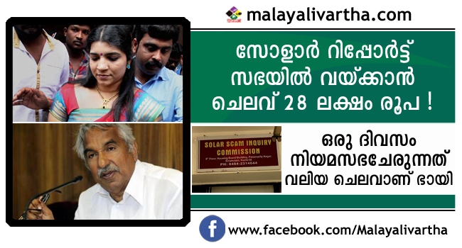 നിയമസഭയില് സോളാര്കമ്മീഷന് റിപ്പോര്ട്ട് വയ്ക്കാനായി നവംബര് 9ന് യോഗം ചേരും. റിപ്പോര്ട്ടും നടപടി രേഖയ്ക്കും സഭയുടെ മേശപ്പുറത്ത് വയ്ക്കുമെന്ന് മുഖ്യമന്ത്രി ഒരു വാക്ക് പറയും.ആവശ്യമെങ്കില് ചെറിയൊരു പ്രസംഗവും. ഒരു ദിവസം സഭ ചേരാന് 26 ലക്ഷം വേണമെന്നാണ് കണക്ക്. സിറ്റിങ് ഫീസും യാത്ര ബത്തയും എംഎല്എമാരുടെ ചിലവും ജീവനക്കാരുടെ ഓവര് ടൈം ശമ്ബളവുമൊക്കെയായിട്ടാണ് ഇത്രയും ചിലവ്.