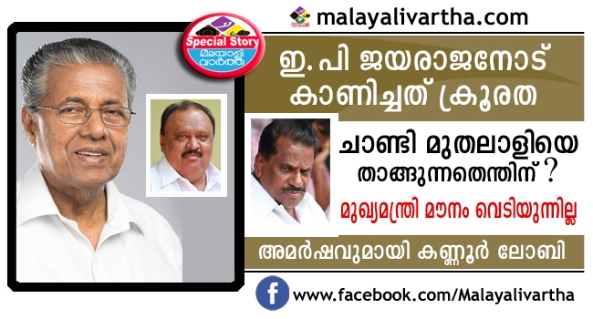 ഇ.പി ജയരാജനോട് കാണിച്ചത് ക്രൂരത; മുഖ്യമന്ത്രി മൗനം വെടിയുന്നില്ല, ചാണ്ടി മുതലാളിയെ താങ്ങുന്നതെന്തിന്? അമര്ഷവുമായി കണ്ണൂര് ലോബി