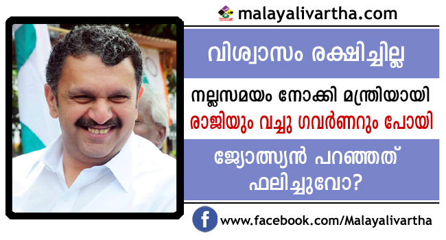 നല്ല സമയം നോക്കിയാണ് മന്ത്രിയായി സത്യപ്രതിജ്ഞ ചെയ്തത്. മൂന്നുമാസത്തിനകം മന്ത്രി സ്ഥാനത്തുനിന്ന് ഇറങ്ങേണ്ടിവന്നു. സത്യപ്രതിജ്ഞ ചൊല്ലിത്തന്ന ഗവര്ണര് രണ്ടു മാസത്തിനകം മരിക്കുകയും ചെയ്തു. അതേസമയം, ആരുടെയും മുഖത്തുപോലും നോക്കാതിരുന്ന കുട്ടിക്കാലത്ത് തന്റെ മുഖത്തുനോക്കി പിതാവിന്റെ പാതയില് സഞ്ചരിക്കുമെന്ന് ഒരാള് പ്രവചിച്ചിരുന്നു. അത് സംഭവിക്കുകയും ചെയ്തു. സ്വന്തം കാരണം കൊണ്ട് രണ്ടു വീഴ്ചയുണ്ടാകുമെന്ന് പിതാവ് കെ. കരുണാകരനോട് ജ്യോത്സ്യന് പറഞ്ഞു.