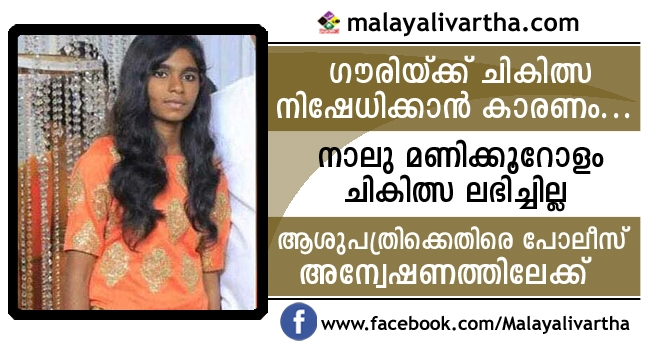 ഗൗരിയ്ക്ക് ചികിത്സ നിഷേധിച്ചു, നാലു മണിക്കൂറോളം ചികിത്സ ലഭിക്കാതെയാണ് ഗൗരി മരിച്ചതെന്ന് പോലീസ്, ഗൗരിയ്ക്ക് തലയ്ക്കും നട്ടെല്ലിനും പരിക്കേറ്റിട്ടും ഡോക്ടമാര് തിരിഞ്ഞ് നോക്കിയില്ല, ആശുപത്രിക്കെതിരെ പൊലീസ് അന്വേഷണം ആരംഭിച്ചു, ആശുപത്രിയിലെ രേഖകളും പൊലീസ് പരിശോധിക്കും