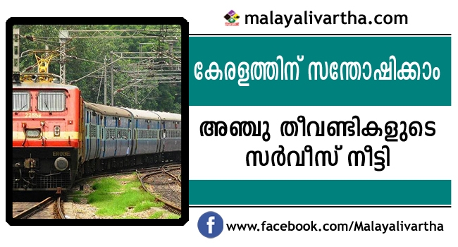 കേരളപ്പിറവി ദിനം മുതല് സംസ്ഥാനത്തേക്ക് അഞ്ചു തീവണ്ടികളുടെ സര്വീസ് നീട്ടി. എന്നാല് പുതിയ രണ്ടു വണ്ടികള്പട്ടികയിലുണ്ടെങ്കിലും എന്ന ഓടിത്തുടങ്ങുമെന്ന് പറയുന്നില്ല.