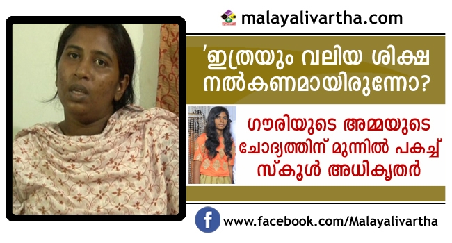 തന്റെ മകളുടെ മരണത്തിന് ഉത്തരവാദികളായവര്ക്കെതിരെ നടപടി എടുത്തില്ലെങ്കില് മരണം വരെ സ്കൂളിന് മുമ്പില് കുടുംബത്തോടെ സത്യഗ്രഹം ഇരിക്കുമെന്ന് ഗൗരിയുടെ അമ്മ ശാലി. ഇളയ മകള്ക്ക് നല്കിയ തെറ്റായ ശിക്ഷണത്തെ ചോദ്യം ചെയ്തതിന് ഇത്ര വലിയ ശിക്ഷ തന്റെ കുടുംബത്തിന് നല്കണമായിരുന്നോ എന്നും നെഞ്ചുപൊട്ടുന്ന വേദനയോടെ ഈ അമ്മ ചോദിക്കുന്നു.