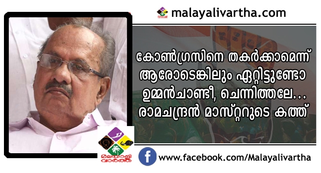 കോണ്ഗ്രസിനെ തകര്ക്കാമെന്ന് ആരോടെങ്കിലും ഏറ്റിട്ടുണ്ടോ ഉമ്മന്ചാണ്ടീ, ചെന്നിത്തലേ... രാമചന്ദ്രന് മാസ്റ്ററുടെ കത്ത്