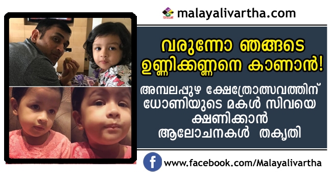 ഒറ്റ പാട്ടുകൊണ്ട് മലയാളികളുടെ ഹൃദയം കവര്ന്ന ഇന്ത്യന് ക്രിക്കറ്റര് മഹേന്ദ്ര സിംഗ് ധോണിയുടെ മകള് സിവയെ അമ്ബലപ്പുഴ ക്ഷേത്രോത്സവത്തിലേക്ക് ക്ഷണിക്കാന് ക്ഷേത്ര കമ്മിറ്റി ഒരുങ്ങുന്നു. മലയാളത്തിലെ എക്കാലത്തെയും ഹിറ്റുകളില് ഒന്നായ 'അമ്ബലപ്പുഴേ ഉണ്ണിക്കണ്ണനോടു നീ..!' എന്ന ഗാനം ആലപിച്ചാണ് കുഞ്ഞു സിവ ഇപ്പോള് താരമായിരിക്കുന്നത്.