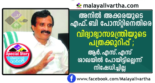 വിദ്യാഭ്യാസമന്ത്രി കെ.എന് രവീന്ദ്രനാഥിന് മുമ്പ് ആര്.എസ്.എസ്, ബി.ജെ.പി ബന്ധം ഉണ്ടായിരുന്നെന്ന വടക്കാഞ്ചേരി എം.എല്.എ അനില് അക്കരയുടെ ഫെയിസ്ബുക്ക് പോസ്റ്റിനെതിരെ മന്ത്രി വാര്ത്താക്കുറിപ്പിറക്കി. എം.എല്.എ ഫെയിസ് ബുക്കില് തന്നെക്കുറിച്ച് പറഞ്ഞിട്ടുള്ള ആരോപണം വസ്തുതാ വിരുദ്ധമാണ്. എന്നിട്ടും യാഥാര്ത്ഥ്യം മറച്ചുവെച്ച് വ്യാജ ആരോപണങ്ങള് ഉന്നയിക്കുന്നതില് പ്രതിഷേധിക്കുന്നു എന്ന് പറഞ്ഞാണ് കുറിപ്പ് അവസാനിക്കുന്നത്. എന്നാല് മന്ത്രി ആര്.എസ്.എസ് പ്രവര്ത്തകനായിരുന്നെന്നും പണ്ട് ശാഖകളില് പങ്കെടുത്തിരുന്നെന്നും അനില് അക്കര ആരോപിച്ചിരുന്നു. അതേക്കുറിച്ച് വാര്ത്താക്കുറിപ്പില് ഒന്നും പറയുന്നില്ല. എ.ബി.വി.പി പ്രവര്ത്തകനായിരുന്ന മന്ത്രി തൃശൂര് സെന്റ് തോമസ് കോളജില് ചെയര്മാന് സ്ഥാനാര്ത്ഥിയായി പത്രിക നല്കിയിരുന്നെന്നും അനില് അക്കര ചൂണ്ടിക്കാട്ടിയിരുന്നു.