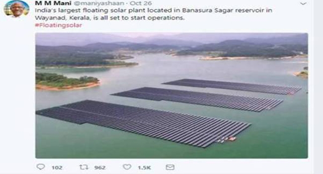 'ഇന്ത്യയിലെ ഏറ്റവും വലിയ ഫ്ളോട്ടിംഗ് സോളാര് പ്ലാന്റ് വയനാട്ടിലെ ബാണാസുര സാഗര് റിസര്വോയറില് ആണെന്ന് മന്ത്രി വ്യാഴാഴ്ച ട്വീറ്റും ചെയ്തിരുന്നു.