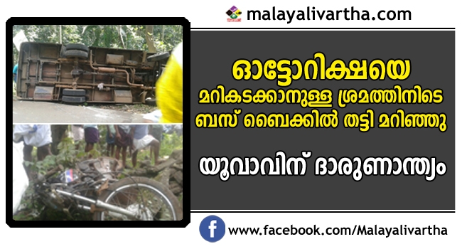 സ്വകാര്യ ബസ് ബൈക്കിലിടിച്ചു മറിഞ്ഞ് ബൈക്ക് യാത്രക്കാരന് മരിച്ചു, 14 പേര്ക്ക് പരിക്ക്