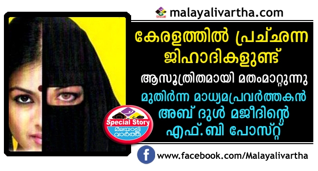 കേരളത്തില് പ്രച്ഛന്ന ജിഹാദികള് ധാരാളമുണ്ട്. അവര്ക്ക് നിയമവിരുദ്ധ മാര്ഗങ്ങളിലൂടെ വിദേശത്തു നിന്ന് ധാരാളം പണമെത്തുന്നുണ്ട്. പലതരം പ്രലോഭനങ്ങളിലൂടെയും മറ്റും അവര് ആസൂത്രിതമായി ആളുകളെ മതംമാറ്റുന്നുണ്ടെന്നും മുതിര്ന്ന മാധ്യമപ്രവര്ത്തകനും പത്രപ്രവര്ത്തക യൂണിയന് മുന് സംസ്ഥാന കമ്മിറ്റി അംഗവുമായ അബ് ദുള് മജീദ്. ആസൂത്രിത മതംമാറ്റത്തെ കുറിച്ച് യഥാര്ത്ഥ മതേതരവാദികള് പറയാന് തുടങ്ങിയിട്ട് കാലമേറെയായി. എന്നാല് അതിനിടയില് കയറി ഹിന്ദുത്വ വര്ഗീയവാദികളും ഇതൊക്കെ പറയുന്നത് ജിഹാദികള്ക്കു സൗകര്യമാകുകയായിരുന്നെന്നും അദ്ദേഹം ഫെയിസ്ബുക്കിലൂടെ വെളിപ്പെടുത്തുന്നു.