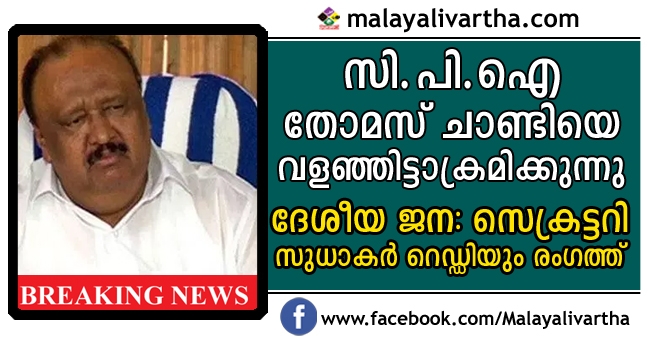 ഗതാഗതമന്ത്രി തോമസ് ചാണ്ടിയെ സി.പി.ഐ സംസ്ഥാന നേതൃത്വത്തിന് പിന്നാലെ ദേശീയ നേതൃത്വവും വളഞ്ഞിട്ടാക്രമിക്കുന്നു. തോമസ് ചാണ്ടി അധികാര ദുര്വിനിയോഗം നടത്തിയെന്നും അഴിമതിക്കാര്ക്ക് ഇടത് മുന്നണിയില് സ്ഥാനമില്ലെന്നും ദേശീയ ജനറല് സെക്രട്ടറി സുധാകര് റെഡ്ഡി വ്യക്തമാക്കി. സംസ്ഥാന സര്ക്കാര് ഉചിതമായ തീരുമാനം എടുക്കണമെന്നും റവന്യൂമന്ത്രിയുടെ നിര്ദ്ദേശം പാലിക്കാന് എ.ജി ബാധ്യസ്ഥനാണെന്നും അദ്ദേഹം ആവശ്യപ്പെട്ടു. ഇതോടെ റവന്യൂമന്ത്രിയും എ.ജിയും തമ്മിലുള്ള അഭിപ്രായഭിന്നത സി.പി.എമ്മിലേക്കും സി.പി.ഐയിലേക്കും നീണ്ടിരിക്കുകയാണ്.