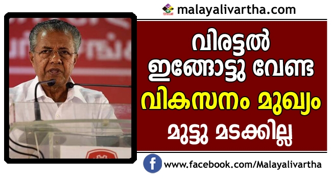 വികസന വിരോധികളുടെ സമ്മര്ദ്ദത്തിനോ വിരട്ടലിനോ വഴങ്ങി സംസ്ഥാനത്തിന്റെ മുന്നോട്ടുള്ള കുതിപ്പിനായി ആസൂത്രണം ചെയ്ത പദ്ധതികള് നിറുത്തിവയ്ക്കാനോ ഉപേക്ഷിക്കാനോ മരവിപ്പിക്കാനോ സര്ക്കാര് ഉദ്ദേശിക്കുന്നില്ലെന്നും മുഖ്യമന്ത്രി പറഞ്ഞു.