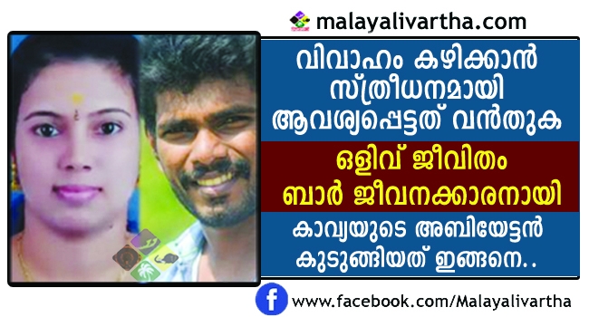 വര്ഷങ്ങളായി പ്രണയത്തിലായിരുന്നു കാവ്യയും അബിനും. വിവാഹ വാഗ്ദാനം നല്കി അബിന് പലതവണ കാവ്യയെ ലൈംഗികമായി ചൂഷണം ചെയ്തിരുന്നു. പിന്നീട് വലിയ തുക സ്ത്രീധനം ആവശ്യപ്പെട്ട് ഇയാള് വിവാഹത്തില് നിന്ന് പിന്മാറി. അബിനെ കാണാനും സംസാരിക്കാനും കാവ്യ പലപ്പോഴും ശ്രമിച്ചെങ്കിലും നടന്നില്ല. തുടര്ന്നാണ് മാനസികമായി തകര്ന്ന കാവ്യ ട്രെയിന് മുമ്പില് ചാടി ജീവനൊടുക്കിയത്. കാവ്യയും അബിനും തമ്മിലുള്ള മൊബൈല്ഫോണ് മെസേജുകള് ഉള്പ്പെടെ കാവ്യയുടെ അമ്മ പൊലീസിന് കൈമാറിയിരുന്നു.