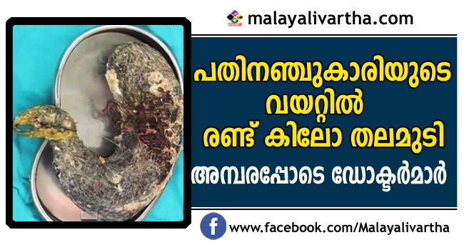 പതിനഞ്ചുകാരിയുടെ വയറ്റില് രണ്ട് കിലോ തലമുടി, തിരുവനന്തപുരം കിംസ് ആശുപത്രിയില് നടത്തിയ അപൂര്വ്വ ശസ്ത്രക്രിയയിലൂടെയാണ് തലമുടി പുറത്തെടുത്തത്