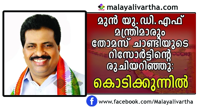 യു.ഡി.എഫിന്റെ പാളയത്തില് പട. കഴിഞ്ഞ സര്ക്കാരിന്റെ കാലത്ത് യു.ഡി.എഫ് മന്ത്രിമാരില് ചിലര് ഗതാഗത മന്ത്രി തോമസ് ചാണ്ടിയുടെ റിസോര്ട്ടില് അതിഥികളായി പോയിരുന്നെന്ന് കൊടിക്കുന്നില് സുരേഷ് എം.പി വ്യക്തമാക്കി. കൊല്ലം പ്രസ്ക്ലബില് വെച്ചാണ് ഏറെ രാഷ്ട്രീയ പ്രത്യാഘാതങ്ങള് സൃഷ്ടിക്കുന്ന കാര്യം അദ്ദേഹം നടത്തിയത്. രണ്ട് വര്ഷം മുമ്പ് കുട്ടനാട് വികസന സമിതി യോഗം തോമസ് ചാണ്ടിയുടെ ലേക്ക് പാലസ് റിസോര്ട്ടില് വെച്ചാണ് നടന്നത്. താന് ഇതിനെ എതിര്ത്തിരുന്നതായും കൊടിക്കുന്നില് വ്യക്തമാക്കി. മാത്രമല്ല, തന്റെ നിലപാടിനെതിരെ യു.ഡി.എഫിലെ പലരും രംഗത്തെത്തി. കോണ്ഗ്രസില് നിന്ന് പോലും തനിക്ക് പിന്തുണ കിട്ടിയില്ലെന്നും കൊടിക്കുന്നില് ചൂണ്ടിക്കാട്ടി.