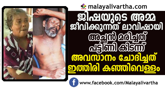 പെരുമ്പാവൂരില് ക്രൂരമായി പീഡിപ്പിച്ച് കൊല്ലപ്പെട്ട ജിഷയുടെ പിതാവിന്റെ മരണം ആരുടെയും കണ്ണുകള് നനയിക്കുന്നതാണ്. ജിഷയുടെ അമ്മ സര്ക്കാറിന്റെയും മറ്റ് സന്നത്ത സംഘടനകളുടെയും ആനുകൂല്യം നേടി ധൂര്ത്തടിച്ച് ആഢംബര ജീവിതം നയിക്കുമ്പോള് ജിഷയുടെ അച്ഛന് പാപ്പുക്കുട്ടി ഒരു തുള്ളി വെള്ളത്തിനായി ബുദ്ധിമുട്ടുകയായിരുന്നു.