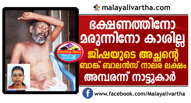 ഭക്ഷണത്തിനോ മരുന്നിനോ കാശില്ലാതെ വാര്ദ്ധക്യത്തില് ഒറ്റപ്പെട്ട് കഴിഞ്ഞ ജിഷയുടെ പിതാവ് പാപ്പു ഇന്നലെയാണ് മരിച്ചത്.വീടിന് സമീപത്തെ റോഡില് വീണാണ് മരണമടഞ്ഞത്.ഭക്ഷണത്തിനോ മരുന്നിനോ കാശില്ലാതെ ദയനീയ അവസ്ഥയിലായിരുന്നു പാപ്പു.