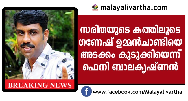 സരിതയുടെ കത്തില് ഉമ്മന്ചാണ്ടി അടക്കമുള്ള കോണ്ഗ്രസ് നേതാക്കളുടെ പേര് കെ.ബി ഗണേഷ്കുമാര് കൂട്ടി ചേര്ത്തതാണെന്ന് സരിതയുടെ മുന് അഭിഭാഷകന് ഫെനി ബാലകൃഷ്ണന് വാര്ത്താസമ്മേളനത്തില് ആരോപിച്ചു. അങ്ങനെയാണ് 21 പേജുള്ള കത്ത് 25 ആയത്. നേതാക്കള്ക്കെതിരായ ലൈംഗിക ആരോപണങ്ങളും പിന്നീട് എഴുതി ചേര്ത്തതാണ്. ആദ്യം എഴുതിയ കത്തില് ഇതൊന്നും ഉണ്ടായിരുന്നില്ല. ഗണേഷിന്റെ ബന്ധുവായ ശരണ്യാ മനോജാണ് പേരുകള് കൂട്ടിച്ചേര്ത്തത്. ഗണേഷിനെ മന്ത്രിയാക്കാത്തതിന്റെ പ്രതികാരം തീര്ക്കാനായിരുന്നു ഇങ്ങനെ ചെയ്തത്. അത് തനിക്ക് മാത്രം അറിയാവുന്ന കാര്യമാണെന്നും ഫെനി പറഞ്ഞു.