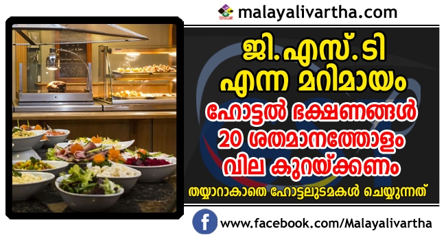 ജി.എസ്.ടി. കുറഞ്ഞതിനാല് ഹോട്ടല് ഭക്ഷണത്തിന് വില കുറയ്ക്കുമെന്ന് കേരള ഹോട്ടല് ആന്ഡ് റെസ്റ്റോറന്റ് അസോസിയേഷന് സംസ്ഥാന പ്രസിഡന്റ് എം. മൊയ്തീന്കുട്ടി ഹാജി പറഞ്ഞു. എല്ലാ ഹോട്ടലിലെയും വില 12 മുതല് 18 ശതമാനംവരെ കുറയ്ക്കും. ഇത് നവംബർ 15 മുതല് നടപ്പാക്കും.
